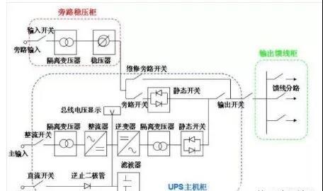 變電站內(nèi)UPS系統(tǒng)一般由電力UPS主機、旁路穩(wěn)壓柜、輸出饋線柜等三部分組成(小功率時也可三合一)。