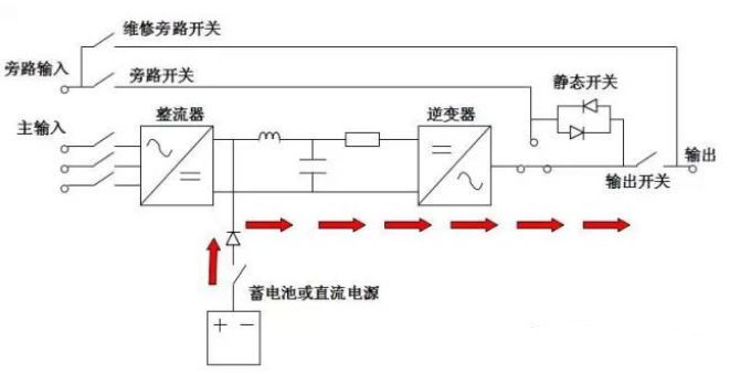 在正常交流電源供應下,整流器將交流電轉(zhuǎn)換為直流電,將市電中的“電源污染”消除,并同時對蓄電池充電。再供給逆變器將直流電轉(zhuǎn)換為交流電,提供更穩(wěn)定的電源給負載。
