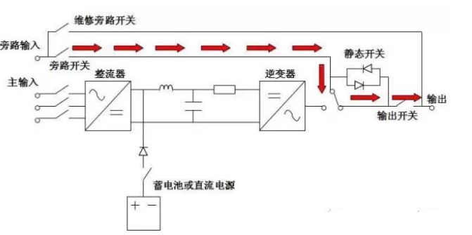 當逆變器發(fā)生異常狀況如逆變器保險絲熔斷、短路等故障時,逆變器會自動切斷以防止損壞,若此時旁路交流電源正常時,靜態(tài)開關會將電源供應轉(zhuǎn)為由旁路備用電源輸出給負載使用。